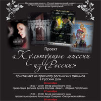 Проект «Культурные миссии из России» приглашает на просмотр российских фильмов в Русский Дом: 16 октября 18:00 – 20:00 Вечер российского кино, презентация фильмов Булата Юсупова «Визит», «Первая Республика» 17…
