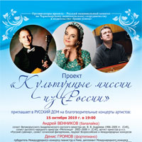 Проект «Культурные миссии из России» приглашает в РУССКИЙ ДОМ на благотворительные концерты артистов: 15 октября 2019 г. в 19:00 Андрей ВЕННИКОВ (балалайка) солист Великорусского Академического русского оркестра им. В.…